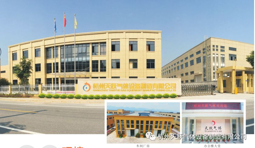 杭州天跃气体设备制造有限公司位于浙江杭州市西南郊国家级经济开发区---富阳区场口经济开发区。 是浙江省科技型中小企业,杭州市高新技术企业,浙江省重质量守诚信双优单位。