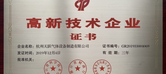 即日杭州天跃气体设备制造有限公司又一次接到了一份殊荣,很荣幸的被浙江省科学技术厅评为“高新技术企业”。喜获此项殊荣奖牌使企业再次溶入了新鲜血液,让企业在良性发展的基础上同时俱增了技术的含量,为创造更高更远更强的企业目标打下了夯实的基础,为天跃气体明天的腾飞添上了美丽的一笔!